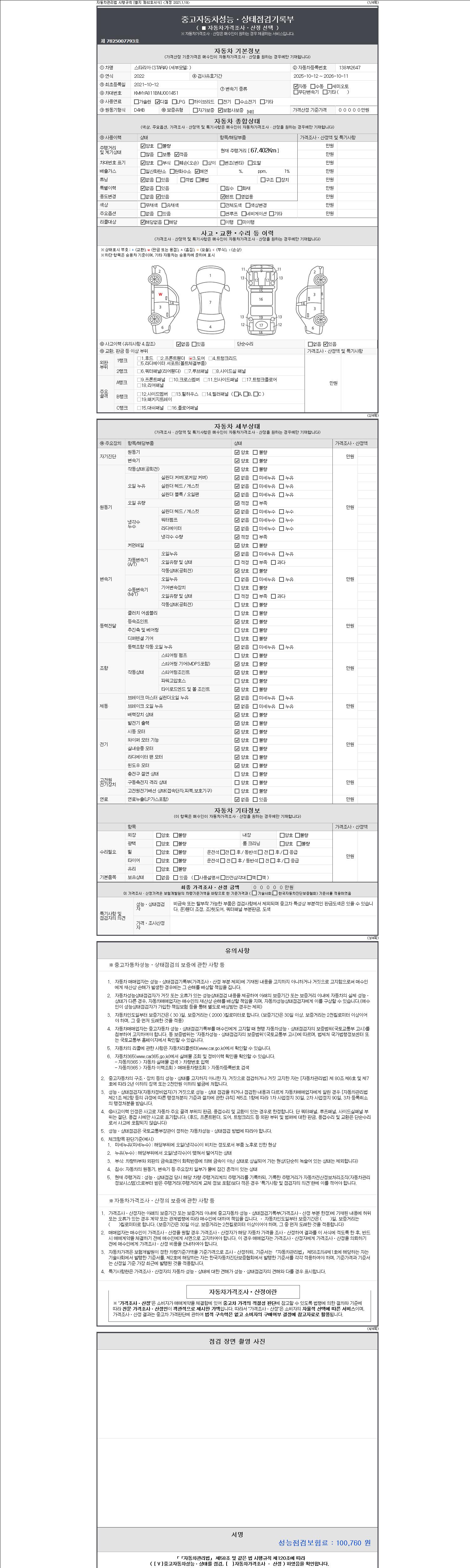 자동차관리법 시행규칙 제120조의 규정에 따라 별지 제 82호서식 《중고자동차 성능, 상태점검 기록부》를 발행한 성능, 상태점검자 및 매매자는 아래의 보증기간 또는 보증거리 이내의 중고자동차, 성능점검 기록부에 기재된 내용과 자동차의 실제 성능, 상태가 다른 경우 계약 또는 관계법령에 따라 매수인에 대하여 책임을 집니다.