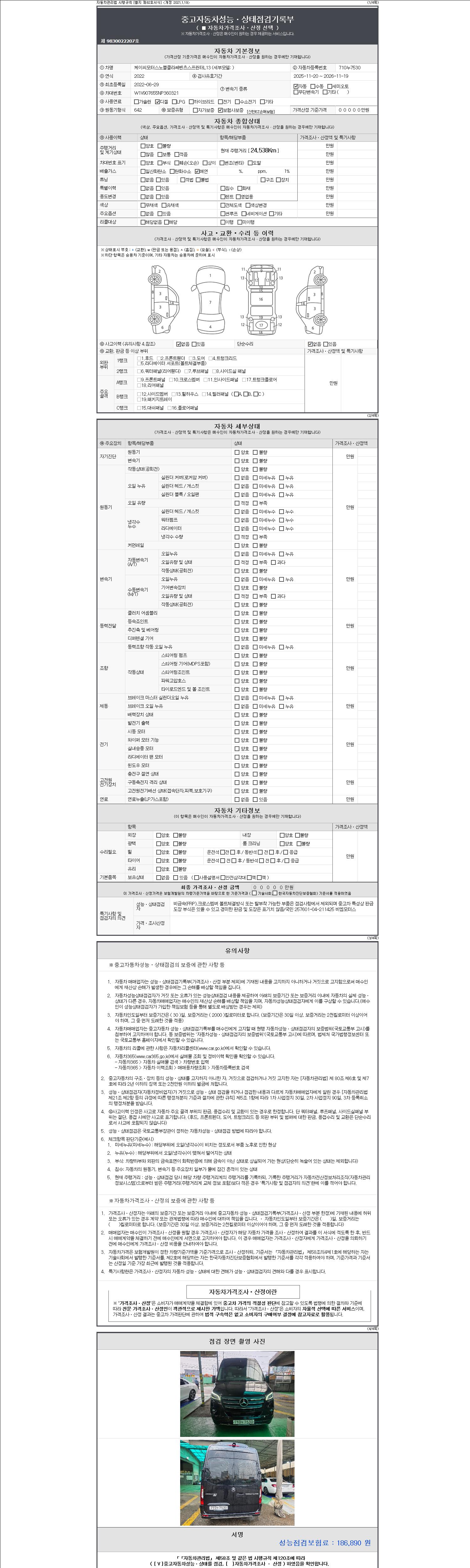 | 주행거리 | 24,538 km | 차량번호 | 710누7530 | 사고유무 | 성능기록부 참조 | 제시번호 | 제 2147483647 호 |
