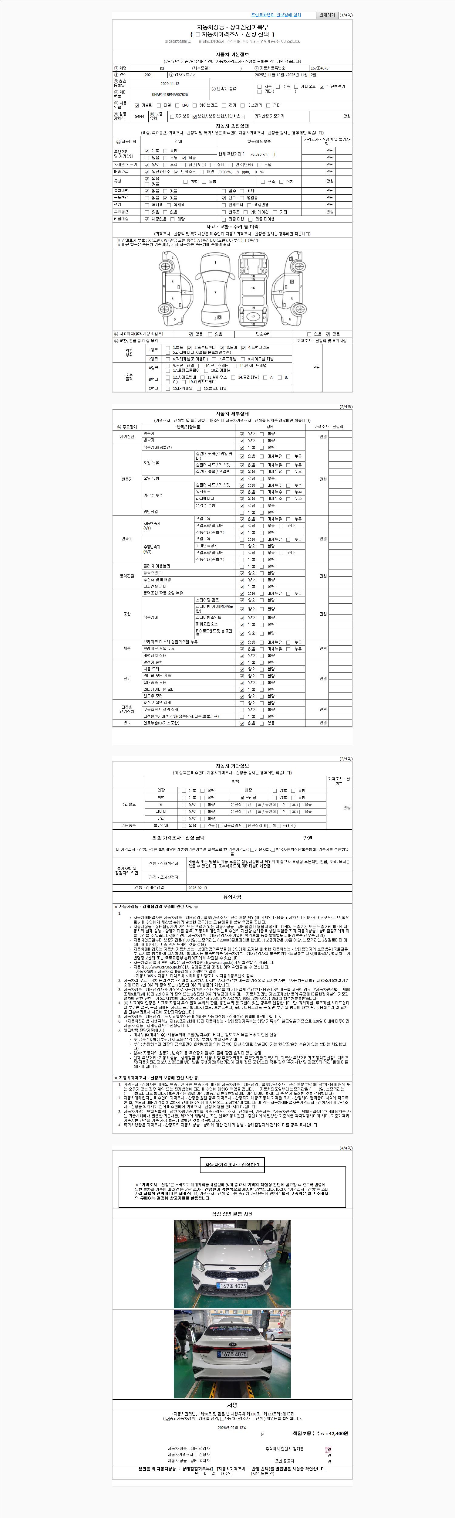 | 주행거리 | 76,580 km | 차량번호 | 167조4075 | 사고유무 | 성능기록부 참조 | 제시번호 | 제 2026008193 호 |
