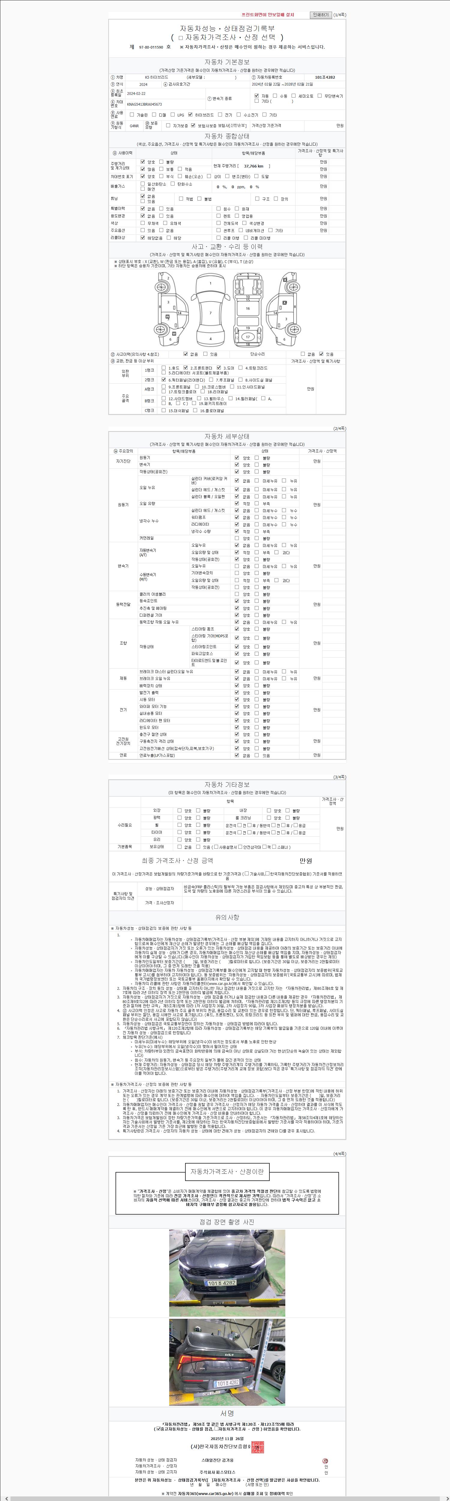 | 주행거리 | 30,000 km | 차량번호 | 101조4282 | 사고유무 | 성능기록부 참조 | 제시번호 | 제 2025039284 호 |
