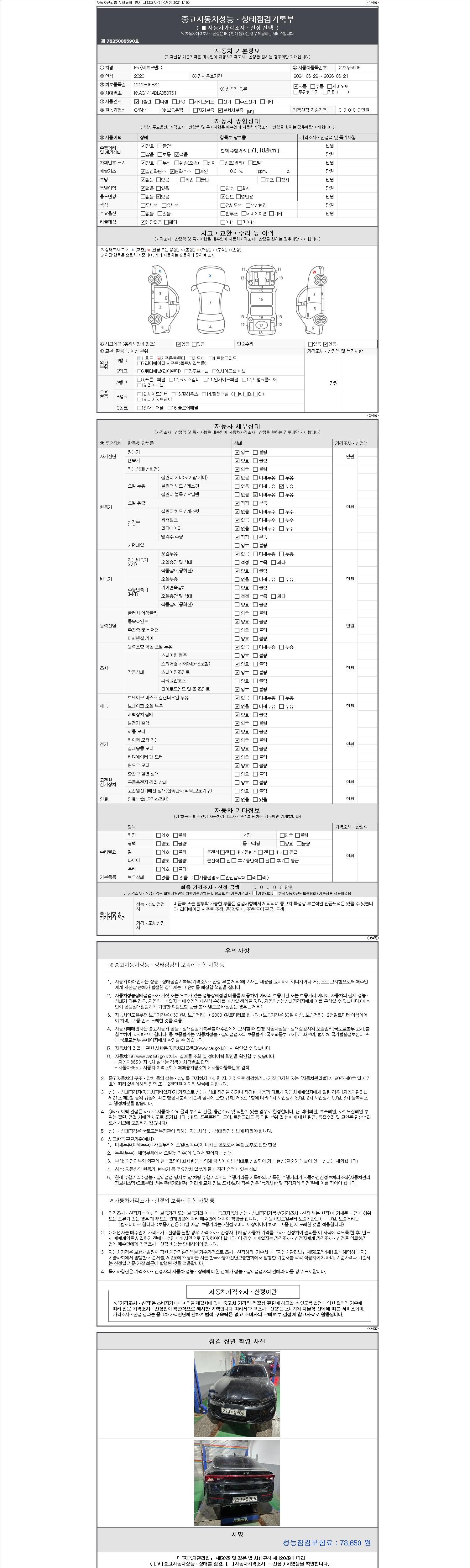 자동차관리법 시행규칙 제120조의 규정에 따라 별지 제 82호서식 《중고자동차 성능, 상태점검 기록부》를 발행한 성능, 상태점검자 및 매매자는 아래의 보증기간 또는 보증거리 이내의 중고자동차, 성능점검 기록부에 기재된 내용과 자동차의 실제 성능, 상태가 다른 경우 계약 또는 관계법령에 따라 매수인에 대하여 책임을 집니다.
