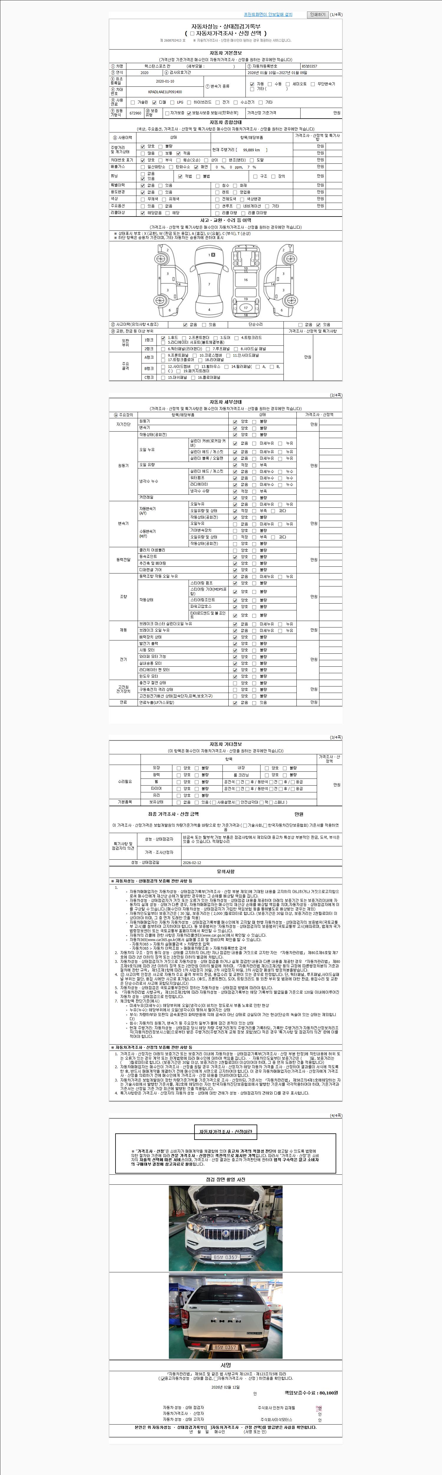 | 주행거리 | 99,889 km | 차량번호 | 85보0357 | 사고유무 | 성능기록부 참조 | 제시번호 | 제 2026008033 호 |