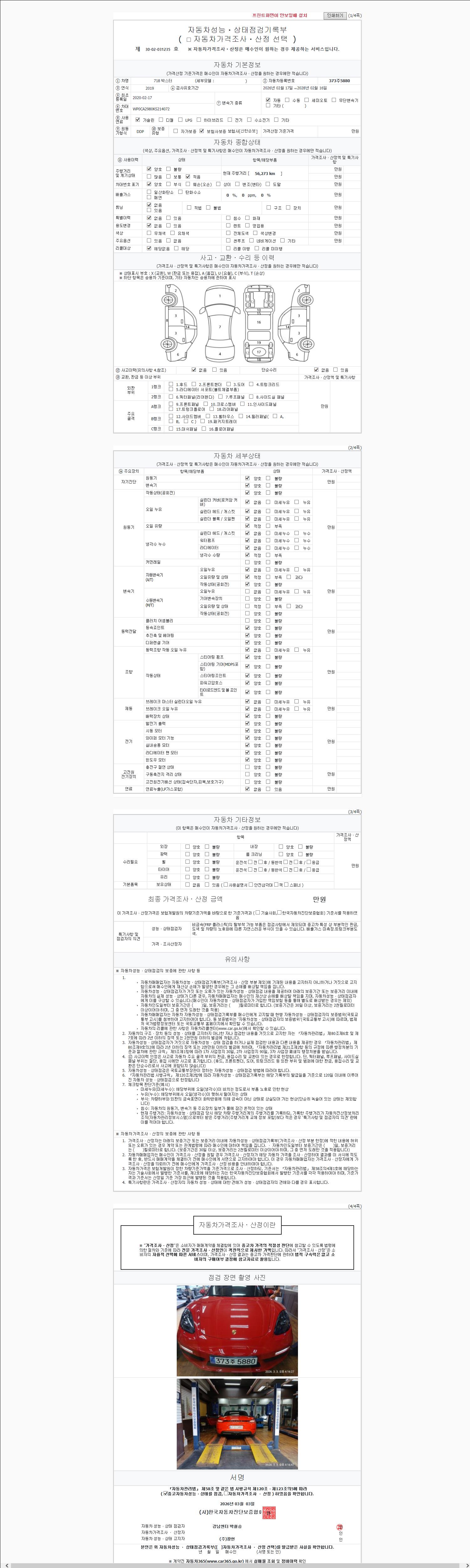 | 주행거리 | 56,273 km | 차량번호 | 373주5880 | 사고유무 | 성능기록부 참조 | 제시번호 | 제 2026026858 호 |