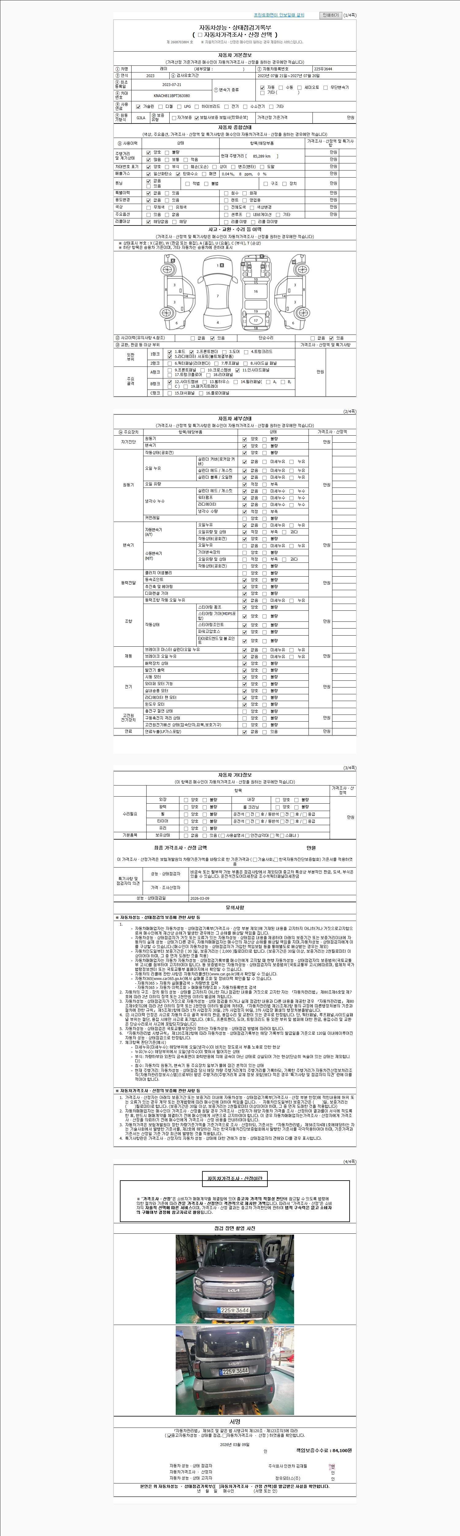 | 주행거리 | 85,289 km | 차량번호 | 225우3644 | 사고유무 | 성능기록부 참조 | 제시번호 | 제 2026011898 호 |