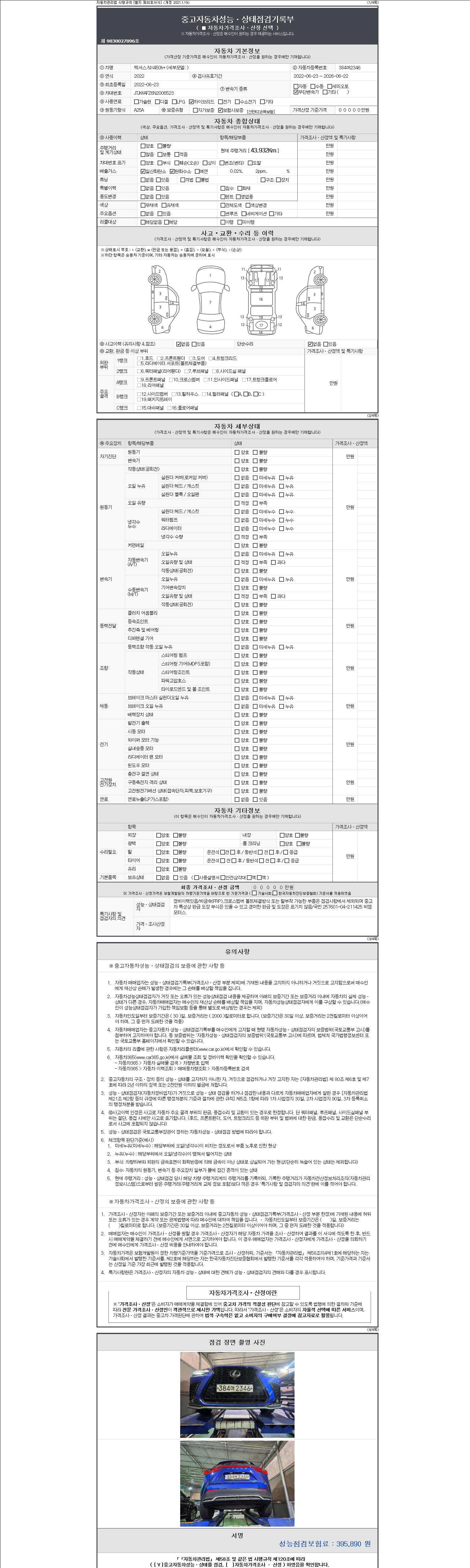 | 주행거리 | 43,932 km | 차량번호 | 384머2346 | 사고유무 | 성능기록부 참조 | 제시번호 | 제 2147483647 호 |
