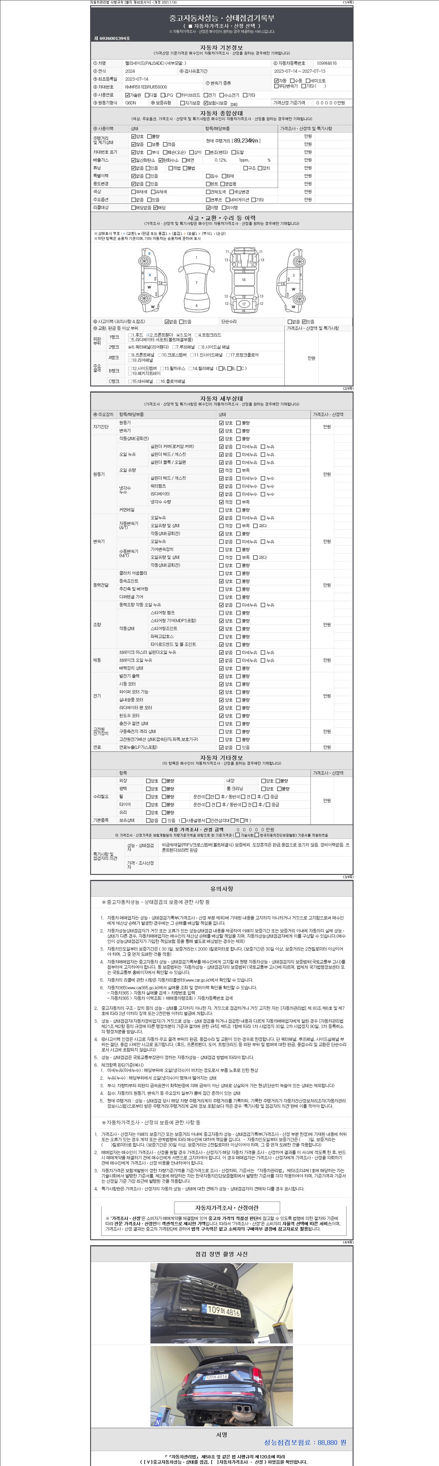 자동차관리법 시행규칙 제120조의 규정에 따라 별지 제 82호서식 《중고자동차 성능, 상태점검 기록부》를 발행한 성능, 상태점검자 및 매매자는 아래의 보증기간 또는 보증거리 이내의 중고자동차, 성능점검 기록부에 기재된 내용과 자동차의 실제 성능, 상태가 다른 경우 계약 또는 관계법령에 따라 매수인에 대하여 책임을 집니다.