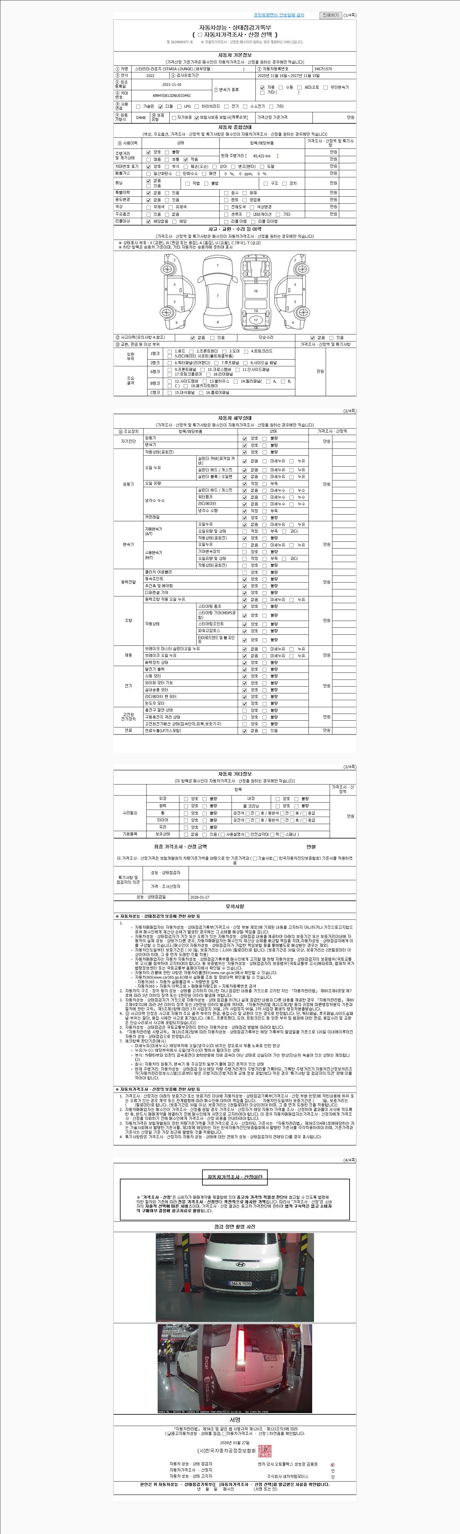 | 주행거리 | 45,433 km | 차량번호 | 346거1570 | 사고유무 | 성능기록부 참조 | 제시번호 | 제 2026011145 호 |